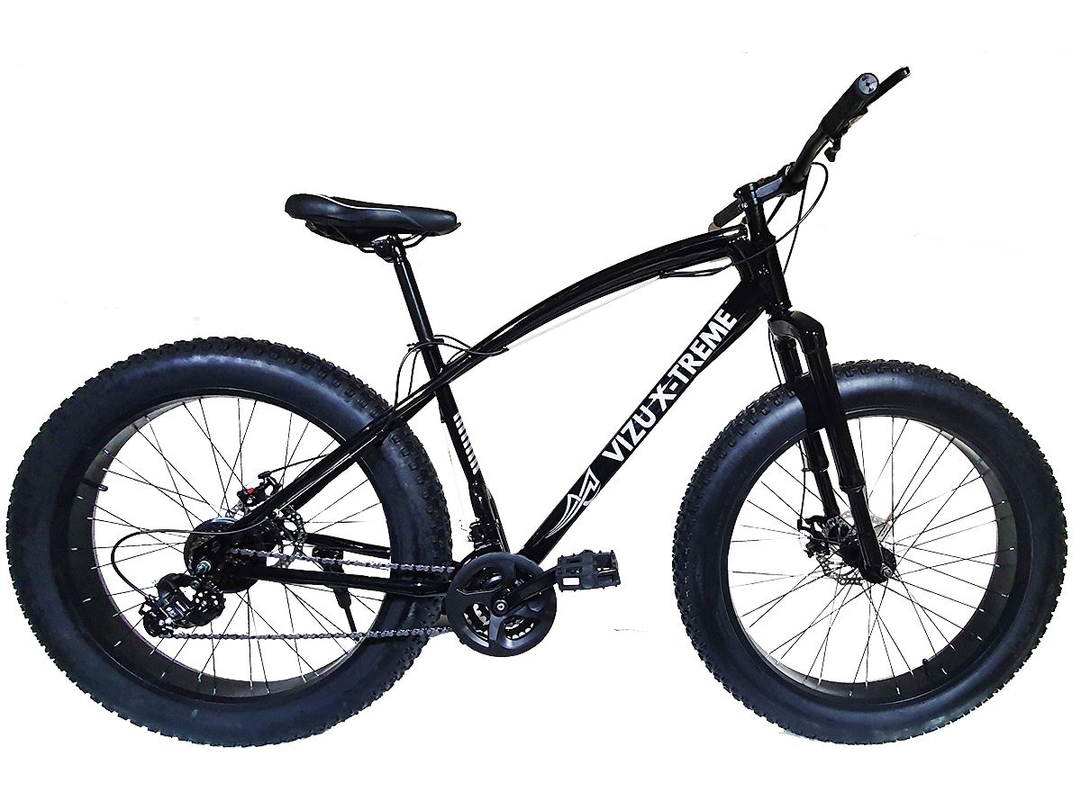 A FAT BIKE VIZU X-TREME é versátil, em aço carbono, ela é forte e suporta até 140 kg, tem 21 marchas, trocador RAPIDFIRE SHIMANO, suspensão dianteira, freio a disco na duas rodas.